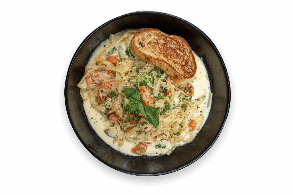 It’s served with chicken and garlic bread, or you can substitute shrimp for an added layer of flavor. This is a dish created for those who believe comfort should never be boring.
